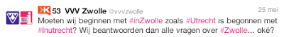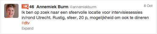 Uit het luisteronderzoek bleek immers dat (potentiele) bezoekers veelvuldig vragen stellen op Twitter, maar dat zij niet of nauwelijks antwoord kregen op hun vragen. Die vragen varieerden van simpele tips voor een leuke lunchplek of een winkel waar een specifiek product te koop is, tot vragen over locaties voor intervisie sessies met 20 personen (incl. diner).