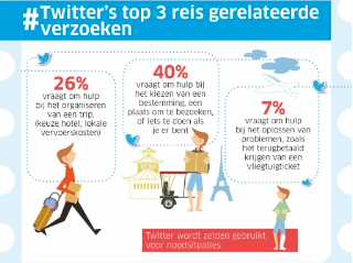 Het onderstaande artikel op DutchCowboys maakt duidelijk hoe de moderne reiziger gebruikt maakt van Twitter. Opvallend is hoe groot het aandeel reizen cq. toerisme is. Zeker 65% van de vragen die via Twitter gesteld worden gaan over het plannen van reizen en toeristische activiteiten. Een verbluffende 40% van de vragen gaat over hulp bij het kiezen van een bestemming, een plaats om te bezoeken of tips over wat daar te doen. Een de vragen worden ook nog eens rechtreeks aan de toeristische professionals gesteld.